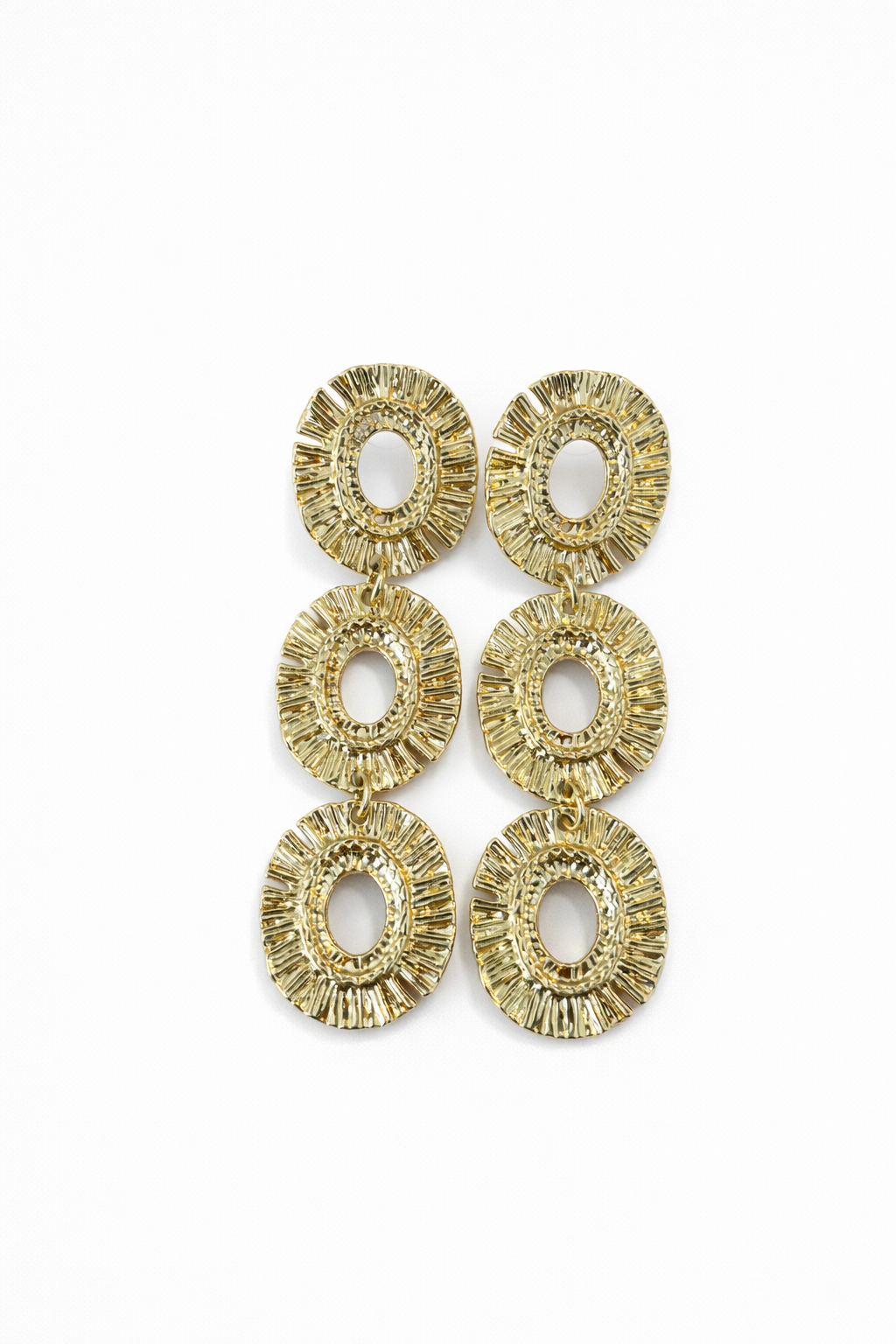 Deze elegante statement oorbellen zijn ontworpen om direct op te vallen, zonder hun verfijnde uitstraling te verliezen. De oorbellen bestaan uit drie sierlijke, ovale schakels met een subtiele structuur die het licht prachtig vangt. De verfijnde details en warme goudtint geven een luxe en vrouwelijke uitstraling.